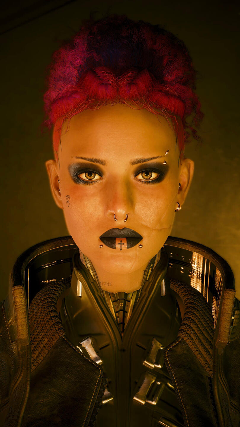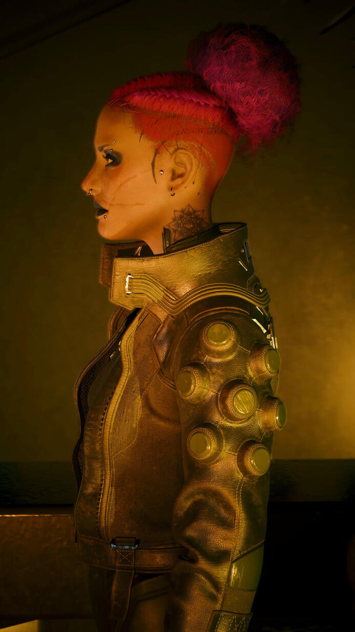 Now in the open world Vera struggles to adapt. Accustomed to bland food, cold white walls, and the same routine, the blinding lights and overstimulating world of Night City leaves them curled up in an alleyway. To their luck however, they soon bump into Jackie Welles. Jackie protects them and temporarily homes them, where they develop a close bond. While they appreciate him dearly, Vera is widely unfulfilled without "proper" structure in their life. They bump into Kurt Hansen, which eventually leads to years of becoming a loyal lapdog for him while doing odd jobs on the side. It's only when they once again meet Jackie that they're called in for help with The Heist. The reunion is a bit tense considering Vera’s sudden disappearance, and the difference in Vera's personality. Where they were once naive they're now almost arrogant and aloof.