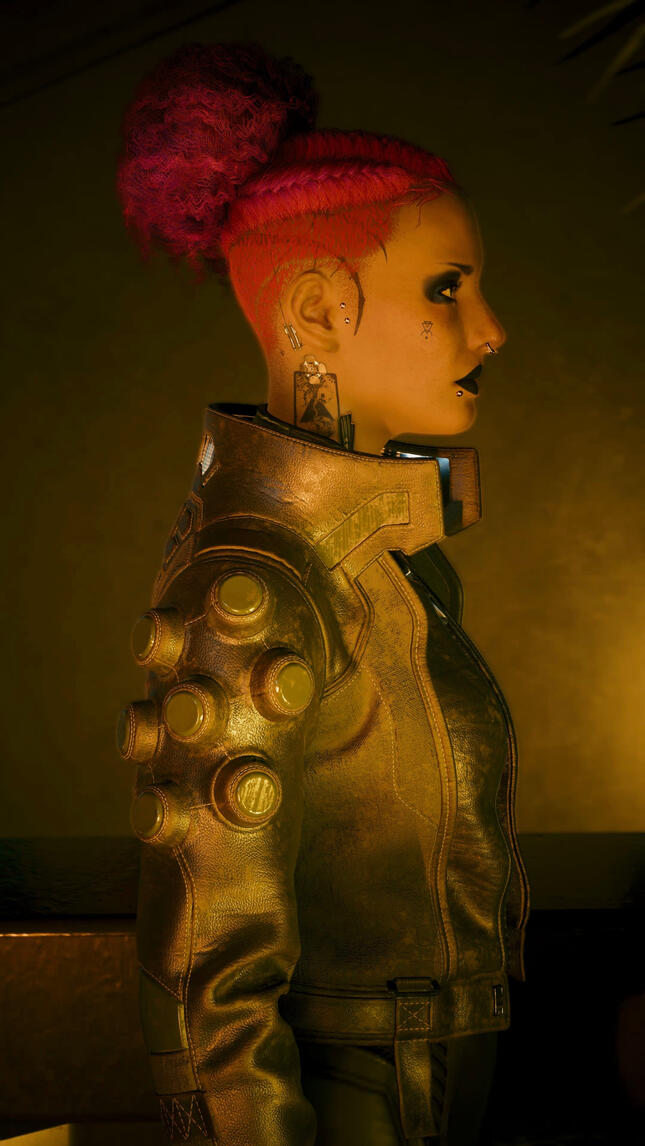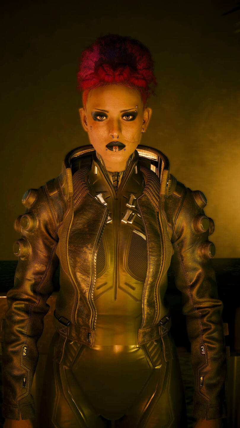 Now in the open world Vera struggles to adapt. Accustomed to bland food, cold white walls, and the same routine, the blinding lights and overstimulating world of Night City leaves them curled up in an alleyway. To their luck however, they soon bump into Jackie Welles. Jackie protects them and temporarily homes them, where they develop a close bond. While they appreciate him dearly, Vera is widely unfulfilled without "proper" structure in their life. They bump into Kurt Hansen, which eventually leads to years of becoming a loyal lapdog for him while doing odd jobs on the side. It's only when they once again meet Jackie that they're called in for help with The Heist. The reunion is a bit tense considering Vera’s sudden disappearance, and the difference in Vera's personality. Where they were once naive they're now almost arrogant and aloof.